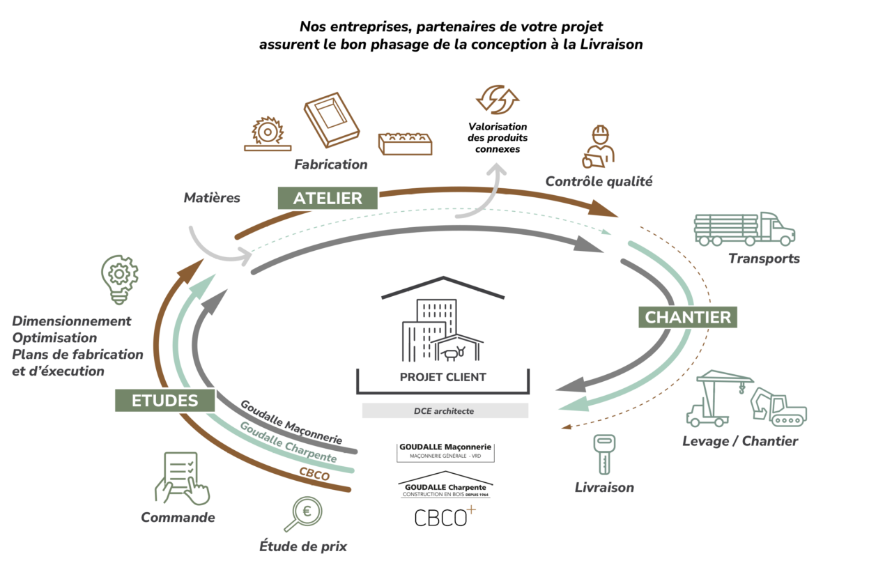 Depuis 2006 les entreprises Goudalle Charpente et CBCO partagent 12 000 m² d’ateliers et bureaux répartis sur les 8 hectares du site.