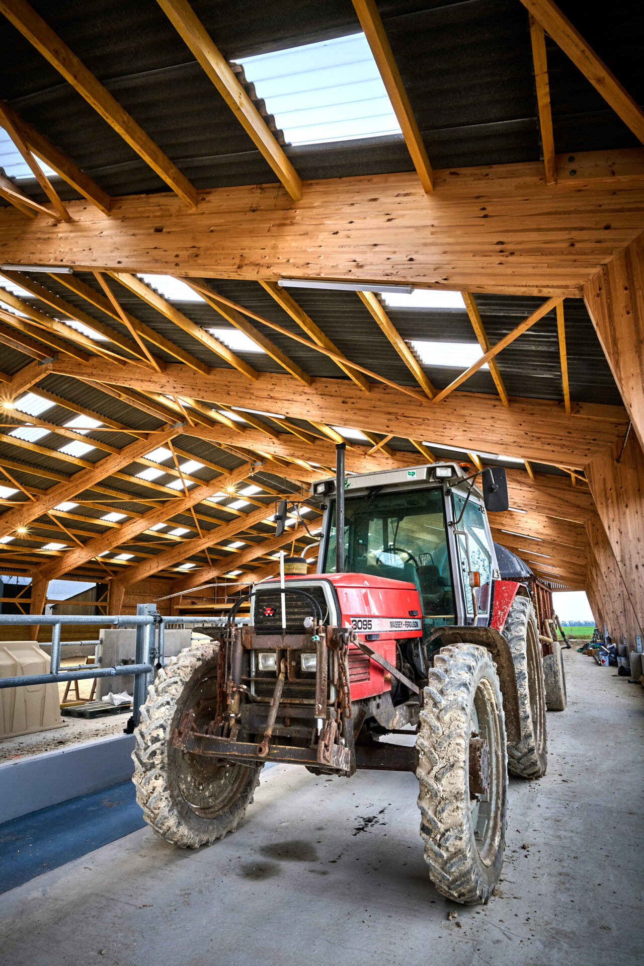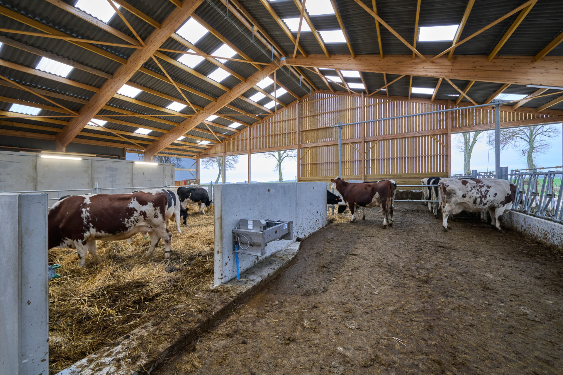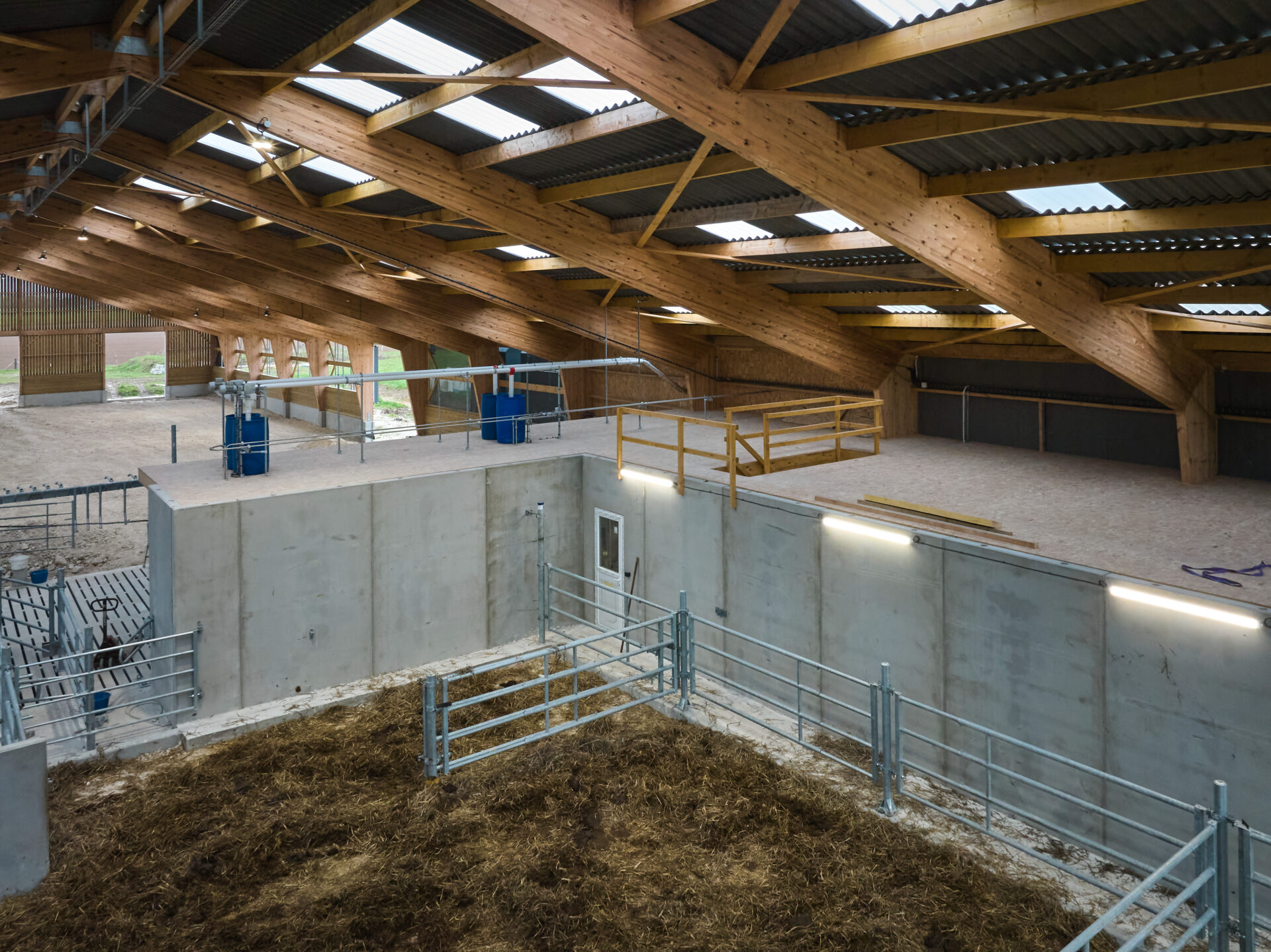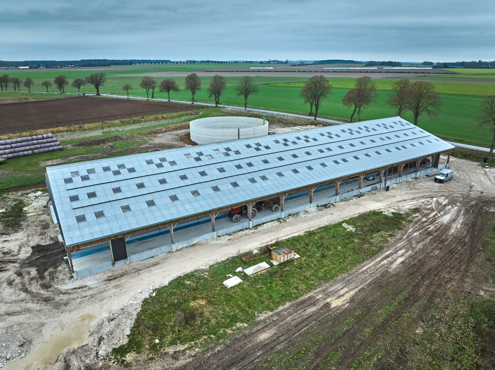 Création d’un bâtiment à destination de vaches laitières avec aires paillées, couloir d’alimentation et laiterie. Le chantier a été conduit en collaboration avec Goudalle Charpente qui a réalisé la charpente, la couverture et les bardages.